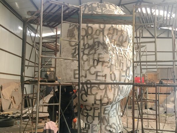 Looking at this head sculpture, which is crafted from high-quality 316L stainless steel with golden painting surface treatment. It is 4.5 meters high and installed in an outdoor garden.